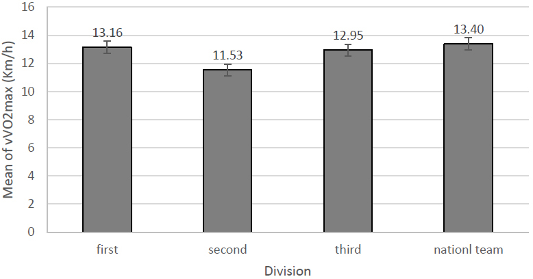 Significant differences were revealed in vV̇O2max between players of different divisions (F=6.63, p < 0.05). The post hoc test (Scheffe) indicated significant differences between the second division and players of all other divisions (second and first, second and third, second and NT), with NT players performing better than all other players. No differences were found between players with different playing positions in the game (Table 1, Fig. (3)).