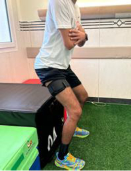 The surgical protocol involved an arthroscopic single-bundle ACLR performed with ipsilateral hamstring, and a thigh tourniquet was applied and inflated to a suprasystolic pressure of ~250mmHg. Femoral fixation was achieved using a cortical suspensory device (ACL-TightRope, Arthrex, Naples, FL, USA), and tibial fixation was secured with an absorbable interference screw (Biosure, Smith & Nephew, United Kingdom). The rehabilitation protocol involved an exercise regimen that included 2 sessions per week. All exercises prescribed were standardised as four sets of 30-15-15-15 reps, while rest was maintained at 30 to 60 seconds between sets. Rehabilitation consisted of two phases: phase 1 occurred from week 1 to week 3, and phase 2 commenced from week 3 onwards. During stage 1, participants engaged in quadriceps exercises, including isometric quadriceps contractions, leg extension over a knee-roll with no weight, and straight leg-raises in a supine position. These exercises progressed to a long sitting position, and then by adding weight. During stage 2, single-leg press, squats (0-30°) (Fig. 1), hamstring curls single leg, and calf raises were incorporated. Exercises that involved resistance were prescribed at 40% of 1 repetition maximum. Both groups were instructed to follow a home exercise program similar to the exercises prescribed in the clinic.
