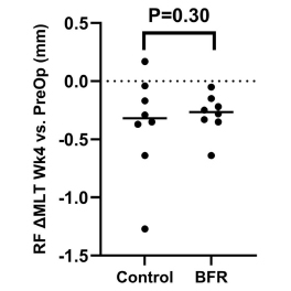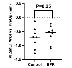 Preliminary findings indicate that after 4 weeks, there were no significant differences in VI and RF MLT (p>0.05) following ACLR between the BFR and control groups.