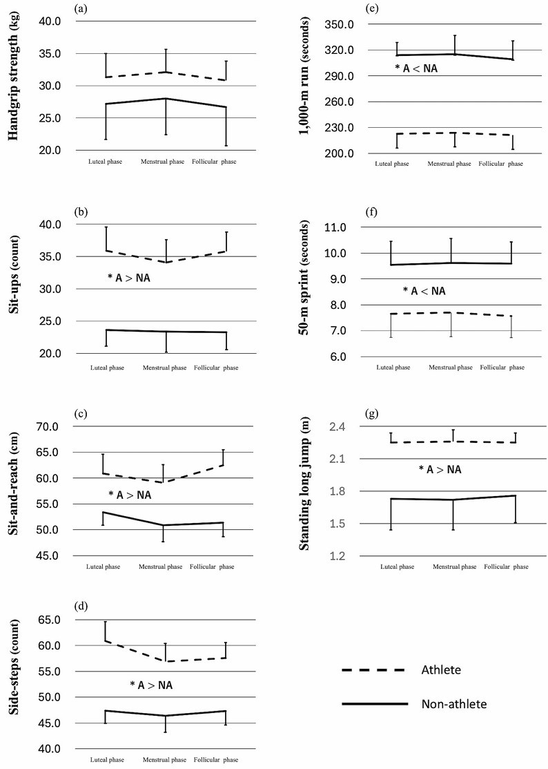 Eighteen female athletes and 13 female non-athlete university students volunteered for this study. Only those who completed all test sessions were included in the final analysis, resulting in the analysis of data from eight athletes (height: 1.66 ± 0.04 m; weight: 57.1 ± 2.9 kg) and eight non-athletes (height: 1.62 ± 0.05 m; weight: 58.0 ± 6.7 kg). Basal body temperature was used to categorize the menstrual cycle into three phases: menstrual, follicular, and luteal. A validated questionnaire assessed physical and mental symptoms related to menstruation. Fitness tests included handgrip strength, number of sit-ups, sit-and-reach, number of side-steps, 1000-m run, 50-m sprint, and standing long jump.